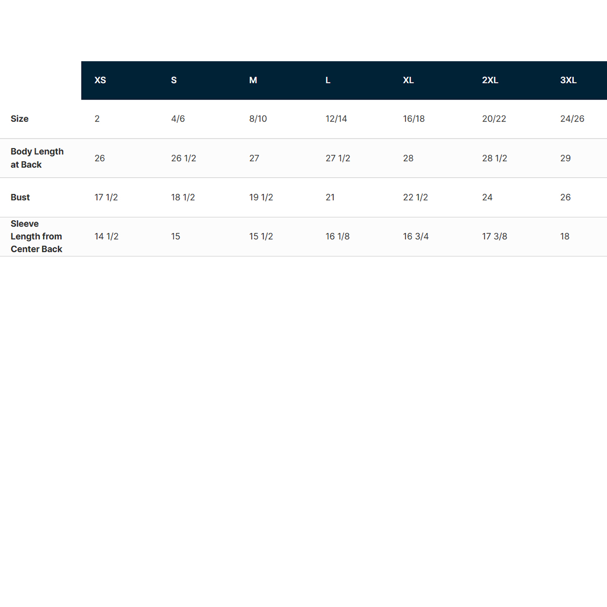 | XS | S | M | L | XL | 2X | 3X | |
